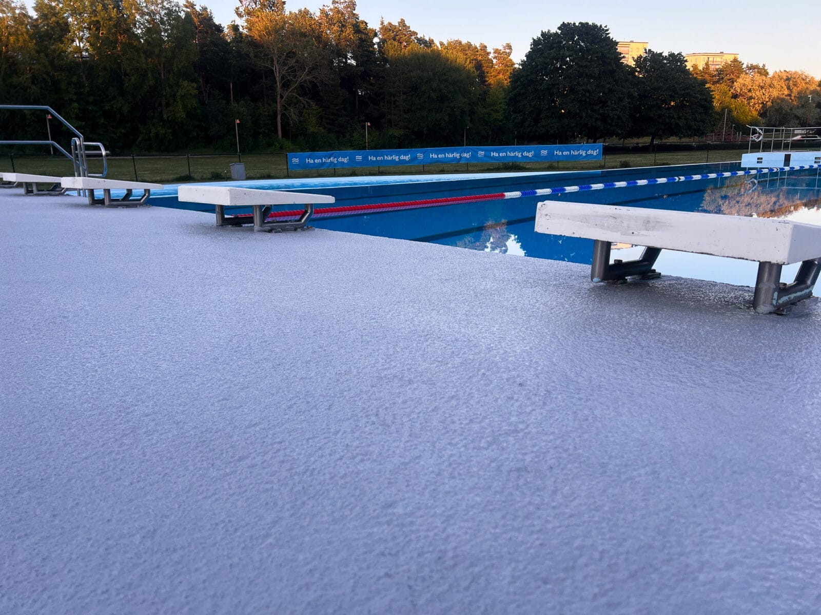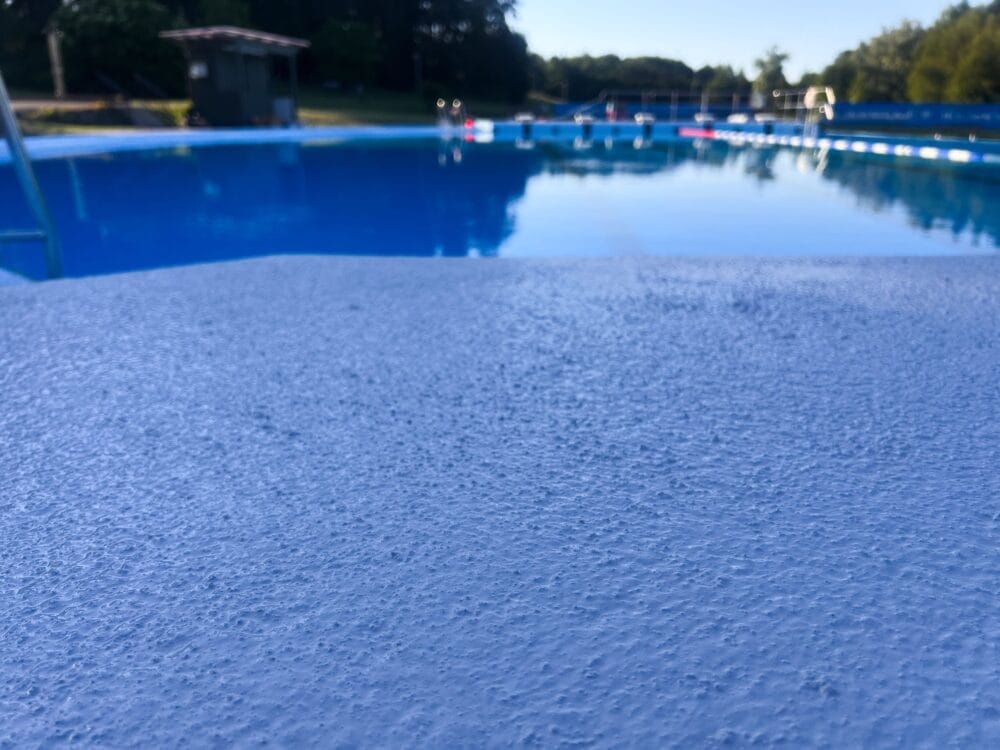 In this particular case, it was also an economic issue. The slippery floor around the three pools was already treated with an epoxy paint, which had some positive effect on the surface. However, after just one season, the treatment had already taken a turn for the worse, and after the third season the floor was as slippery as before. This meant that the treatment had to be repeated at LEAST every three years. The result? Costly.