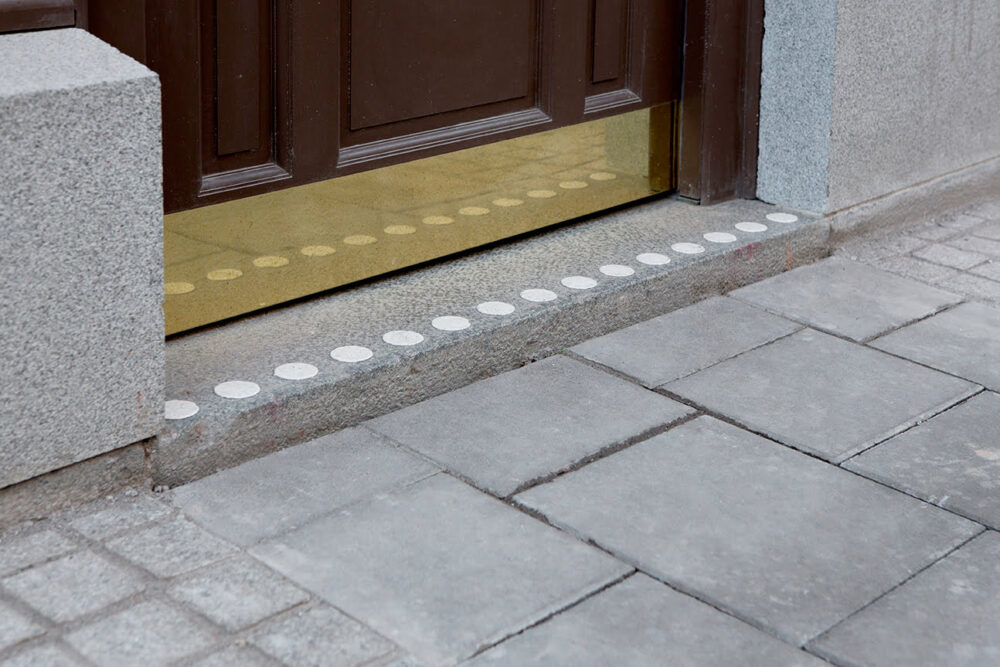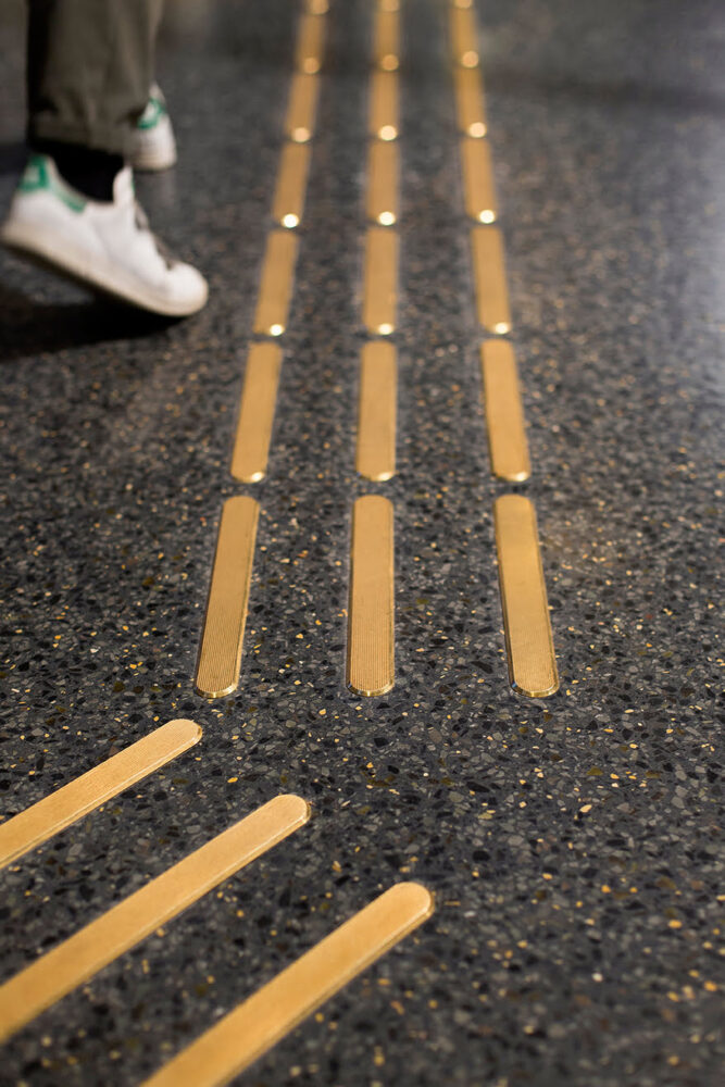 Tactile handrails and brass contrast markings.