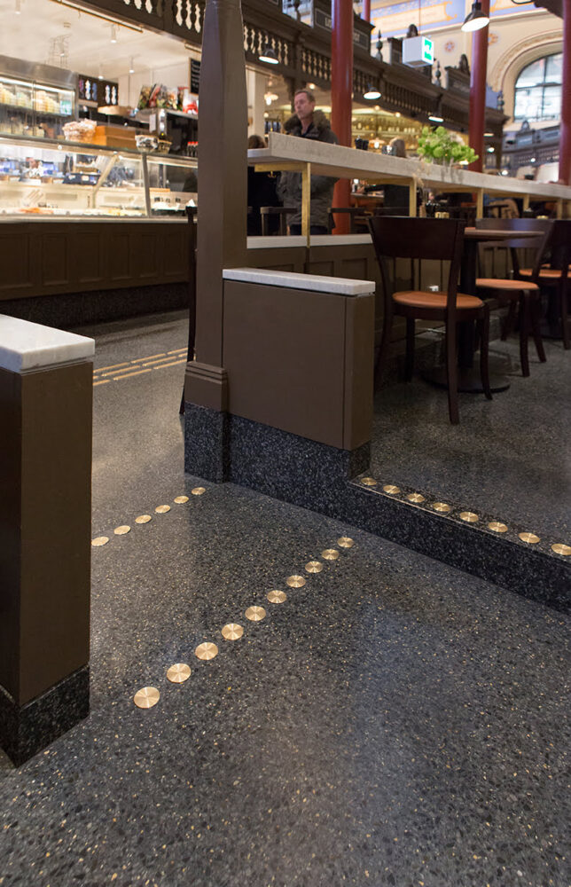 In many places, tactile aids such as handrails and contrast markings are often included just because they are required, and you can clearly see that they are designed to be ‘as invisible as possible’ to those who don’t need them. In Östermalm’s market hall, it’s just the opposite. All the furnishings, be it wall paint, wrought iron details, large tables or small buttons, are part of the whole – as are the tactile aids. The brass cues and contrasting markings take their place and are a natural part of the interior – exactly what the architects were aiming for.