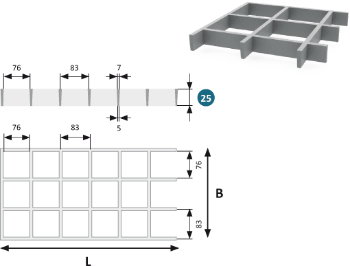 Height: 25 mm, Mesh inner dimensions: 76×76 mm