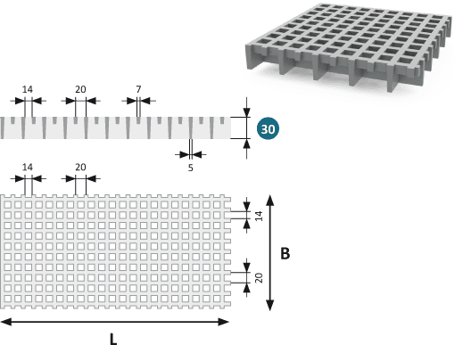GRP grating 30 Micro, mesh 20 × 20 mm