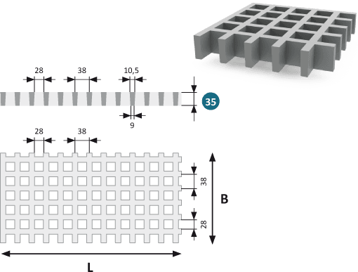 Height: 35 mm, mesh inner dimension: 28 × 28 mm