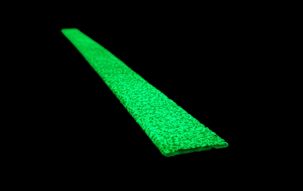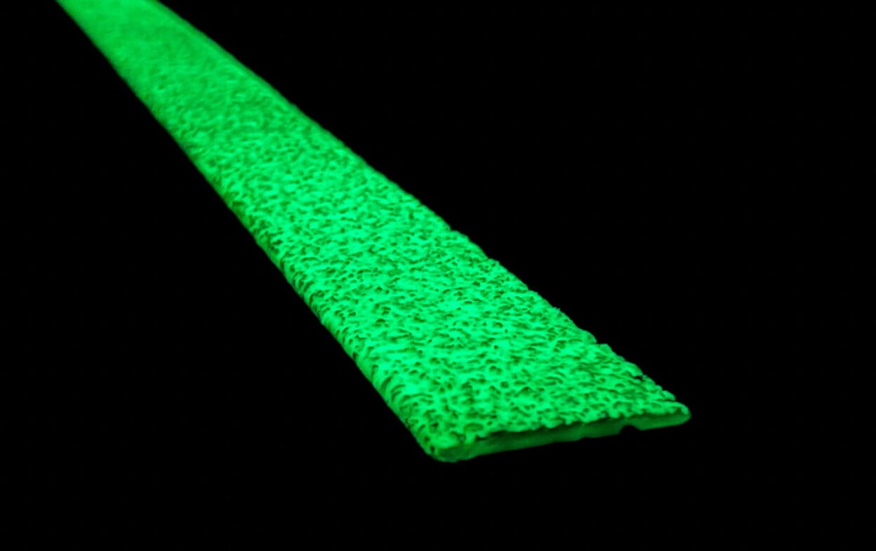A non-slip, corrosion-free and very durable fiberglass strip with a structured surface of silicon carbide, painted in glow-in-the-dark color. The anti-slip strips are used as anti-slip protection and signposting, often on walkways in gratings. Clear and effective marking of escape routes in industrial environments.