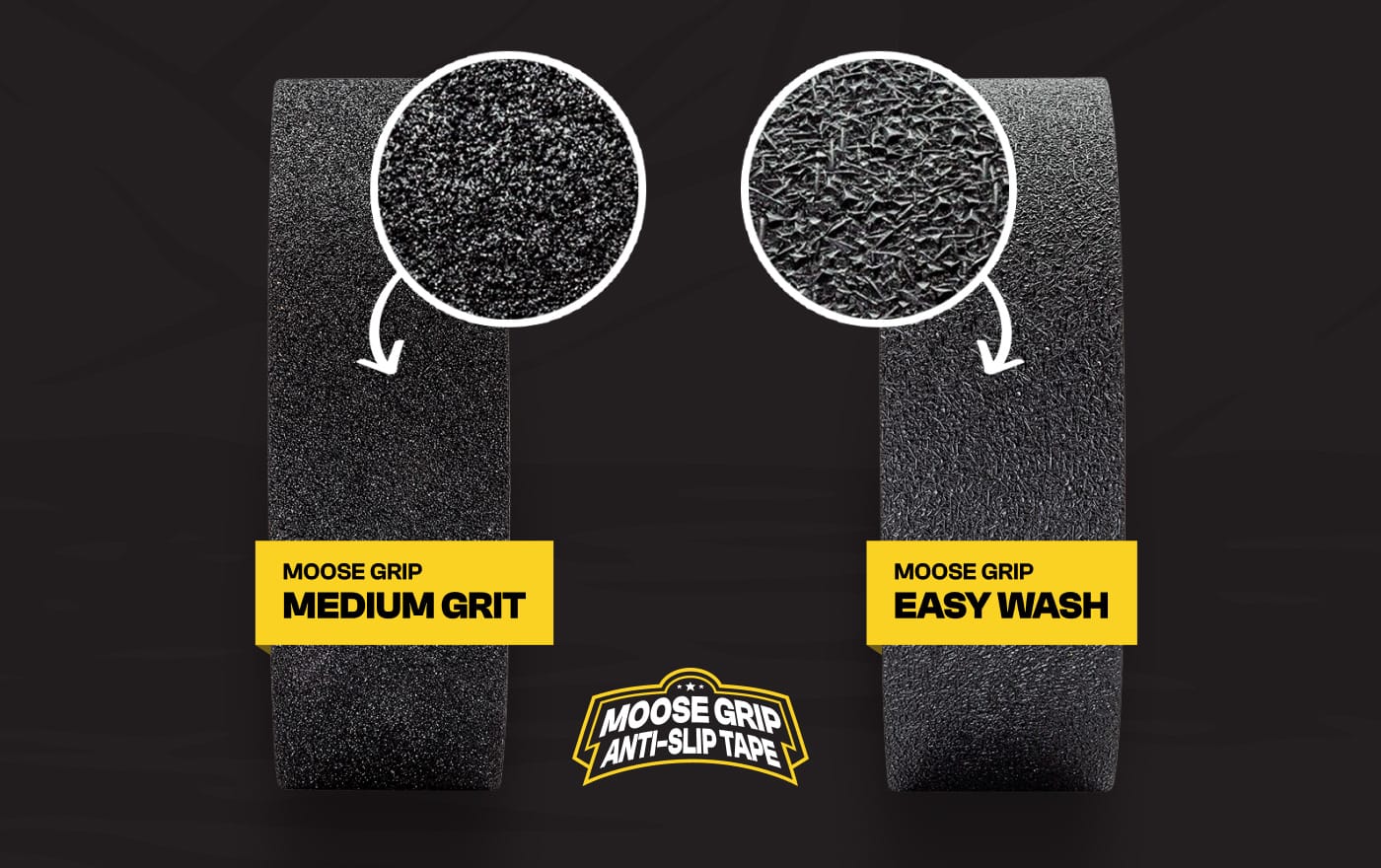 MOOSE GRIP anti-slip tape is available with two different surfaces, Medium grit or Easy wash. Medium grit has a surface similar to sandpaper – like a classic anti-slip tape. Easy wash is not as coarse and instead has a textured plastic surface, developed for environments with higher hygiene requirements.