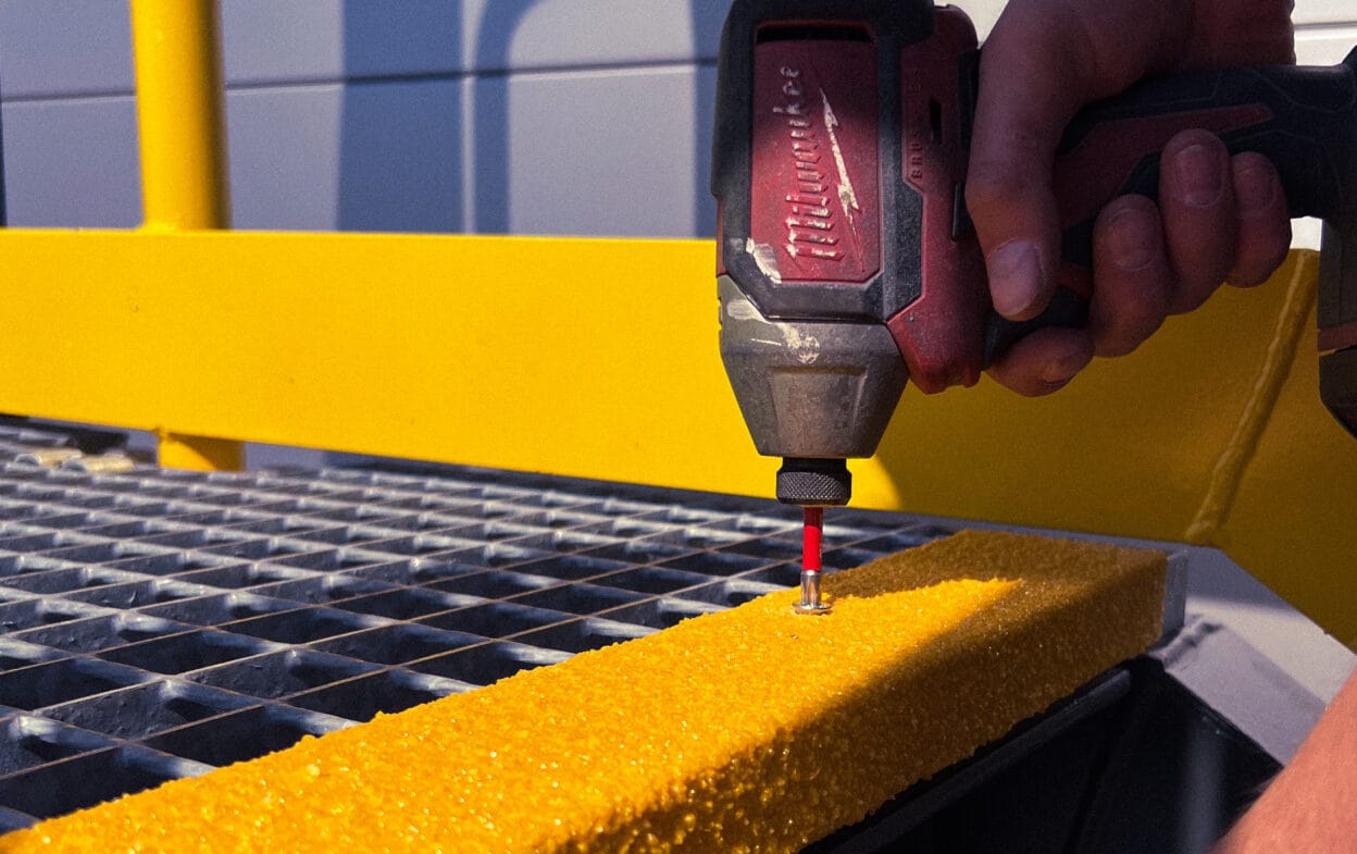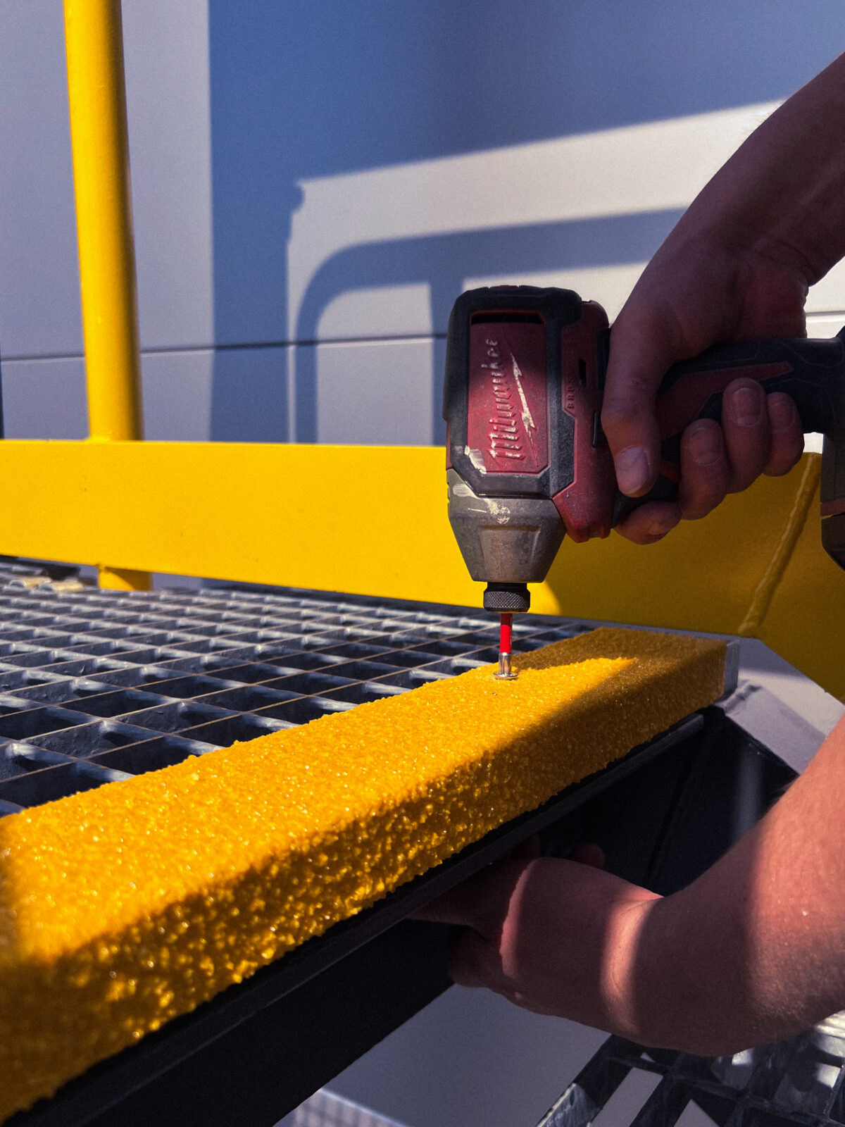 The non-slip stair nosings are made of fiberglass and have a textured surface with grains of silicon carbide, providing a very durable result suitable for industrial, offshore, marine and other heavy industries.