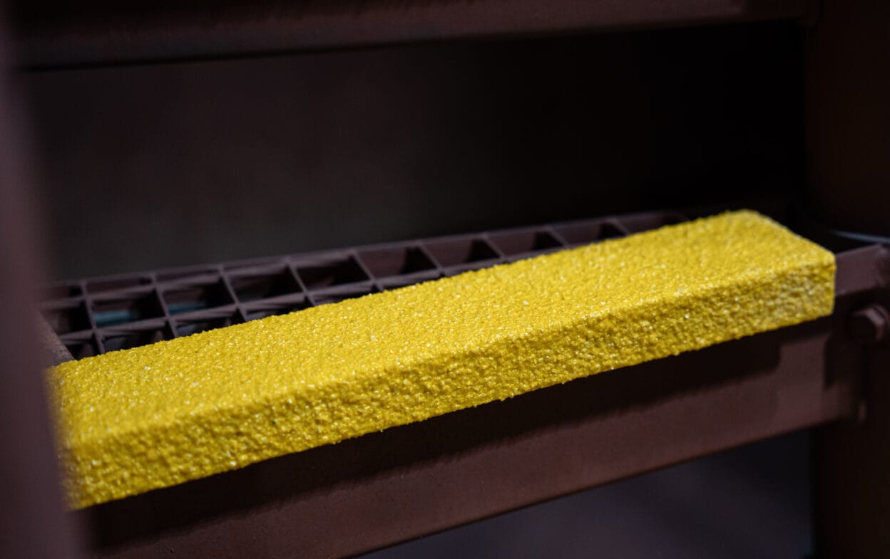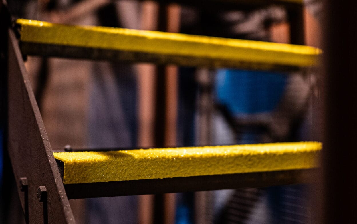 Corrosion-free, maintenance-free and extremely durable fiberglass stair nosings / stair nosing profiles with a highly durable surface for proper slip resistance in industrial environments. The stair nosing profiles are designed to increase safety on stairs, both through anti-slip protection and contrast marking. The profiles are often used in extra exposed environments such as machine halls, sawmills, offshore platforms and industrial plants.
