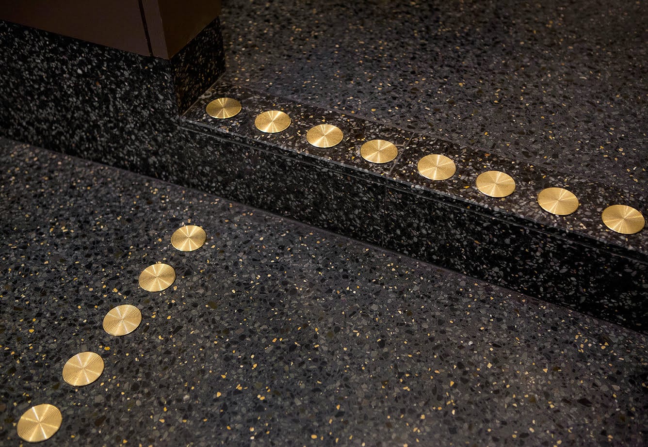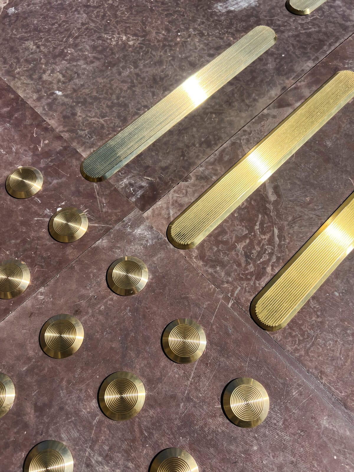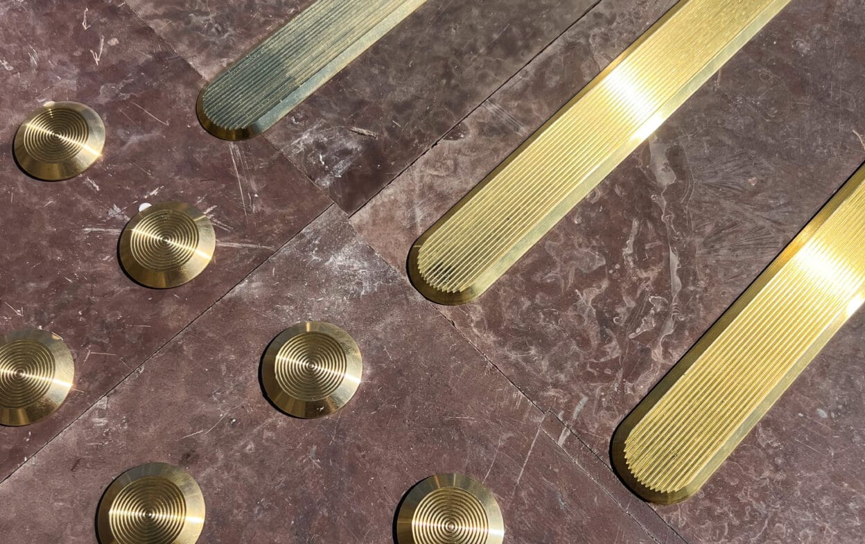 Brass indicators are beautifully colored with an elegant finish, suitable for both dark and light floors – as long as they ensure high contrast with the surface. Both indicators, stop markers and contrast markers are available in three different designs and can be mounted with 3M tape, pins or mounting glue.