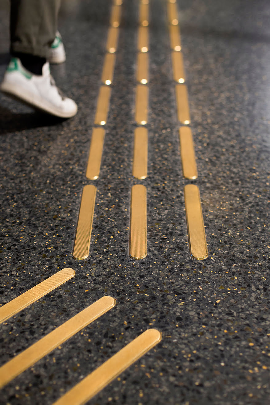 Important to remember: Public premises should be provided with logical pathways that lead between selected target points. In open spaces such as station buildings, receptions and foyers, there should be coherent tactile and visual pathways. The paths should provide directional orientation and safely guide us in the right direction – past obstacles and to the destination points. The tactile indicators should also be installed with different materials and a brightness contrast of at least 0.4 NCS – either lighter or darker than the surroundings.